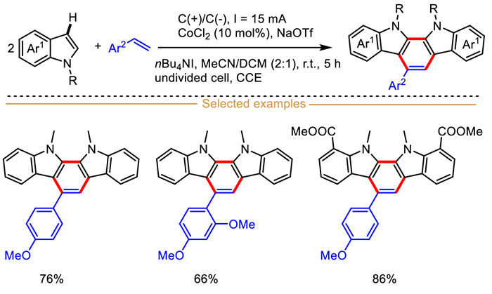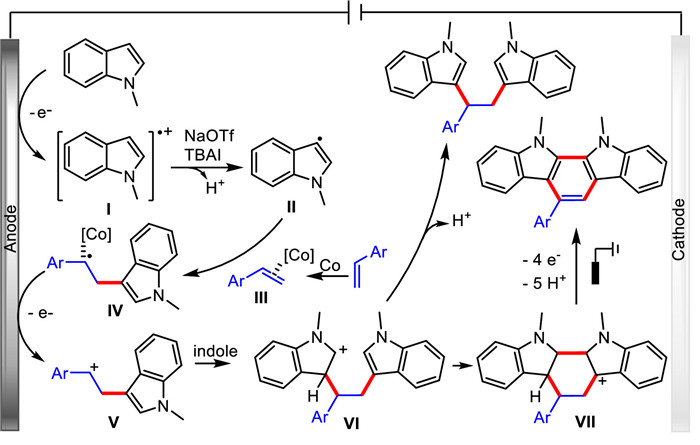 The cyclic voltammetry analysis indicated that 1-methyl indole (EOX = 0.86 V vs. Ag/AgCl) had a lower oxidation potential than 4-methoxystyrene (EOX = 1.25 V vs. Ag/AgCl) in the presence of NaOTf/nBu4NI. A persuasive catalytic mechanism of alkene diarylation and [2 + 2 + 2] cyclization reactions is outlined in Scheme 12. Anodic single electron oxidation of indole initially occurs to deliver the indole-derived radical cation intermediate Ⅰ, which then would execute deprotonation in the presence of NaOTf/nBu4NI to generate indole carbon-centered radical Ⅱ. Meanwhile, alkene coordination with the Co(II) catalyst could generate Co-alkene complex Ⅲ. Subsequently, radical addition of the intermediate Ⅱ across the Co-alkene complex Ⅲ affords the benzyl radical Ⅳ, followed by anodic oxidation to produce the cation intermediate Ⅴ. Finally, cation Ⅴ reacts with one molecule of indole to offer the diarylation product through a deprotonation process using platinum plate as cathode. It is particularly noteworthy that the cation intermediate Ⅵ undergoes intramolecular Friedel-Crafts alkylation, followed by consecutive anodic single-electron oxidation and deprotonation to form the dehydrogenative [2 + 2 + 2] cyclization product when using graphite rod as the anode and cathode. This result is attributed to the lower redox potentials between two graphite rods, which leads to slow electron transfer and requires strong constant current.