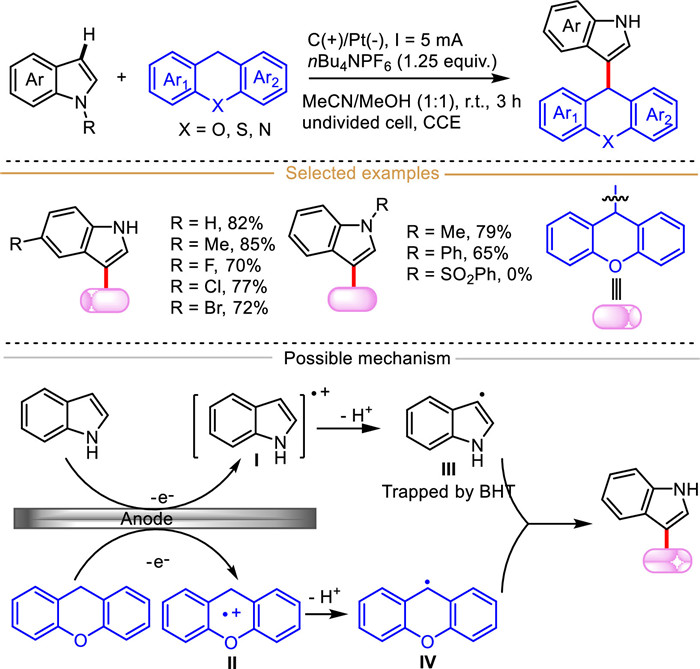 The Minisci alkylation reaction, between electron-deficient heteroarenes with nucleophilic alkyl radical precursor, provides a straightforward and efficient tool for the quick construction of ubiquitous C(sp2)–C(sp3) bond, and is complementary to carbocation-mediated Friedel-Crafts alkylation of electron-rich arenes [70–72]. However, radical-mediated alkylation of indoles remains challenging. This dilemma appears to have been overcome by the recently popular and feasible electrochemical strategy. In 2022, Li et al. depicted a novel electrochemically enabled regioselectivity C(sp2)–H alkylation of electron-rich indoles using activated xanthenes as alkylating reagents in an undivided cell (Scheme 13) [73]. In this C(sp2)–H/C(sp3)–H cross-coupling reaction, various C3-alkylated indoles were constructed in moderate to good yields in the absence of any external chemical oxidants and metal catalysts. Given the electron-deficient characteristics of the radical cations, electron-deficient 1-(phenylsulfonyl)−1H-indole was inert in this transformation. Importantly, this C–H alkylation reaction was almost suppressed in the presence of radical scavenger BHT, wherein a cross-coupled product BHT-indole was detected by GC-MS, which indicated that the indole C(sp2) radical intermediate was involved in this transformation. Considering the inherent nature of benzyl hydrogen in xanthene, a radical–radical coupling mechanism is presented. Initially, indole and xanthene are oxidized at anode into corresponding radical cations Ⅰ and Ⅱ, respectively. Then, these radical cations lose one H+ to deliver the key carbon-centered radical Ⅲ and Ⅳ. Finally, a convincing radical–radical cross-coupling delivers the final product C3-alkylated indole.
