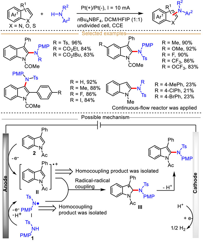 The incorporation of amino into indoles via an electrocatalytic radical cation strategy has broad application prospects. In 2021, Feng et al. depicted an electrochemically driven indole radical cation-mediated C–H/N–H cross-coupling of indole with aniline derivatives for constructing various C-2/C-3 aminated indoles (Scheme 14) [74]. Performing the C–H amination reaction with an electro-rich 1-methyl indole without 2/3 substituents in batch failed to isolate the corresponding coupled product due to the overoxidation of substrates. Interestingly, the C-2 aminated indoles was isolated when electro-rich 1-methylindole reacted with N-Ts anilines in a continuous-flow reactor, albeit with low reaction efficiency. Notably, N-Ts aniline 1 and indole 2 had very close oxidation potential (1.05–1.10 V vs. SCE), revealing that these two coupling partners could be oxidized simultaneously at anode surface to generate corresponding nitrogen-centered radical Ⅰ and indole radical cation Ⅱ, respectively. Moreover, the corresponding homocoupling products were isolated in control experiments, further suggesting that the radical-radical coupling mechanism might be involved in this transformation.