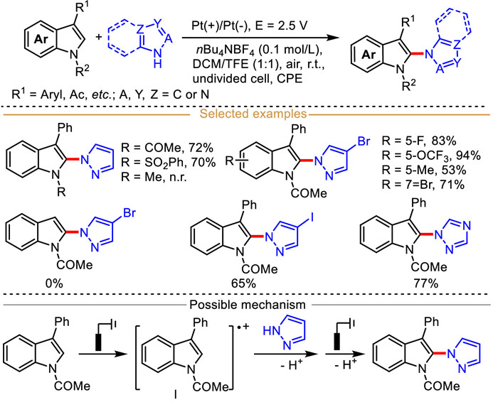 To enhance the application of electrocatalytic indole-derived radical cation in C–N bond construction, Feng et al. established an efficient electrochemical strategy for synthesizing 3-substituent-2-(azol-1-yl)indole derivatives in a undivided cell (Scheme 15) [76]. Satisfactorily, synthetically useful functional group iodine was well tolerated, which should facilitate the further modification of coupled product. Unfortunately, a preliminary survey of 1-methyl-3-phenyl-1H-indole and other indoles without substituents at C3 position resulted in no C–N coupled products. In this transformation process, 1-(3-phenyl-1H-indol-1-yl)ethan-1-one (Ep/2 = 1.35 V vs. SCE) is initially oxidized into an electrophilic indole-derived radical cation intermediate, which is easily trapped by the pyrazole (Ep/2 = 1.62 V vs. SCE), followed by deprotonation to furnish benzyl radical intermediate. The radical intermediate will undergo consecutive anodic oxidation and aromatization to yield the desired coupled product.