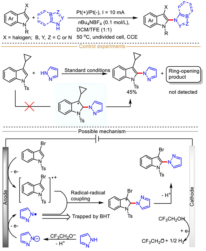Usually, halogen substitutions at the C2/C3 position of indole are difficult to survive in metal-catalyzed systems. For example, the C-2 or C-3 halogenated indoles can easily participate in the formation of C-N bonds, however, the elimination of halogen atoms is hard to circumvent. To address this limitation, in 2022, Feng et al. designed an electrochemical radical cation strategy for C(sp2)−H amination of C-2/C-3 halogenated indoles with N-heterocycles (Scheme 16) [77]. This approach avoids the elimination of halogen atoms and provides a convenient way to construct a series of C-2/C-3 aminated halo-indoles under metal catalyst-free and chemical oxidant-free conditions. Importantly, a variety of aminated reagents, including pyrazole, triazole, benzotriazole, tetrazole and indazole were also assessed for this C(sp2)−H amination, and the relevant coupled product were produced in moderate to good yields. The C–H amination was completely suppressed when 2.0 equiv. BHT was added, wherein a cross-coupled product of BHT with pyrazole, implying that a nitrogen-centered radical was formed in this transformation. Furthermore, a ring-opening product was not detected and corresponding C-N coupled product was isolated in 45% yield, which indicated that a long live benzylic radical was not formed. Mechanism studies proved that the reaction proceeded via a radical-radical coupling pathway.