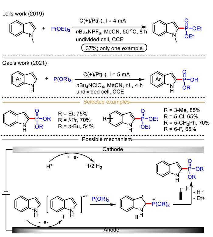 To further explore the application of electrocatalytic indole-derived radical cation in C(sp2)−H phosphorylation of indoles, in 2021, Gao et al. achieved an elegant regiodivergent N-1/C-2 phosphorylation of unprotected N–H free indoles (Scheme 17) [82]. By simply tuning the electrolyte nBu4NI to nBu4NClO4, the C-2 phosphorylated indole was formed preferentially in good yield. It is particularly noteworthy that either electron-withdrawing or electron-donating substitutes on the N-H free indoles were suitable for this phosphorylation in satisfactory yields, which is the deficiency of many electrocatalytic C–H functionalization of indoles. Similarly, an electrocatalytic indole-derived radical cation mechanism is presented in Scheme 17, indole (a lower oxidation potential compared with P(OEt)3) is initially oxidized into the corresponding radical cation intermediate Ⅰ, which then reacts with nucleophilic P(OEt)3 to deliver a new radical cation intermediate Ⅱ. Finally, intermediate Ⅱ undergoes consecutive anodic oxidation, deprotonation, and dealkylation to afford the desired phosphorus-containing indole.