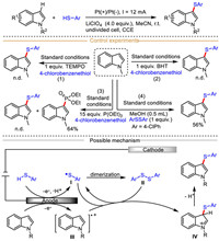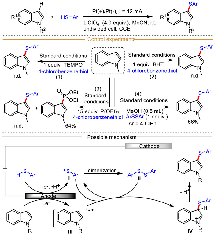 Additionally, 4-chlorobenzenethiol (EOX = 1.27 V vs. Ag/AgCl) and 1-methyl indole (EOX = 1.28 V vs. Ag/AgCl) had very close oxidation potential in acetonitrile. Mechanistically, this C(sp2)–H thiolation begins with the anode oxidative deprotonation of thiophenol to generate the sulfur radical Ⅰ, which usually undergoes rapid dimerization to produce a disulfide Ⅱ. At the same time, indole can also be converted to the indole-derived radical cation Ⅲ at the anode surface via single electron oxidation process. Subsequently, the indole radical cation Ⅲ undergoes either the radical-radical coupling with the anode generated sulfur radical Ⅰ or radical substitution with the disulfide Ⅱ generated from homocoupling of sulfur radical Ⅰ to deliver a cation intermediate Ⅳ. Finally, the desired product is obtained through aromatization of cation intermediate Ⅳ.