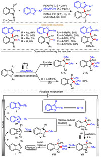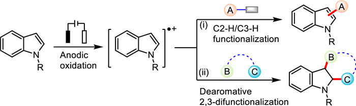 Recently, remarkable achievements have been made in the field of electrochemically enabled indole radical cation-initiated functionalization of indoles. Among the established chemical transformations, they can be roughly divided into two different reaction types (Scheme 2): (ⅰ) The C2−H/C3−H functionalization of indoles, and (ⅱ) the dearomative 2,3-difunctionalization of indoles. Apart from, a small part of ring-opening reaction is also involved.