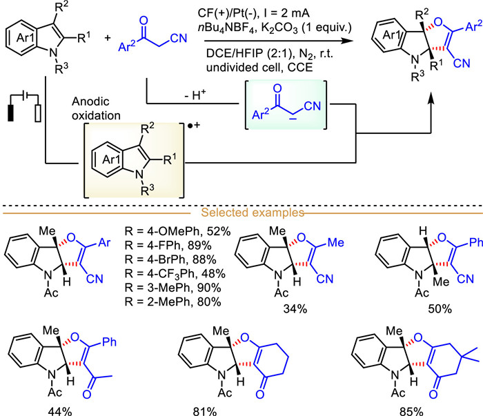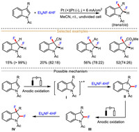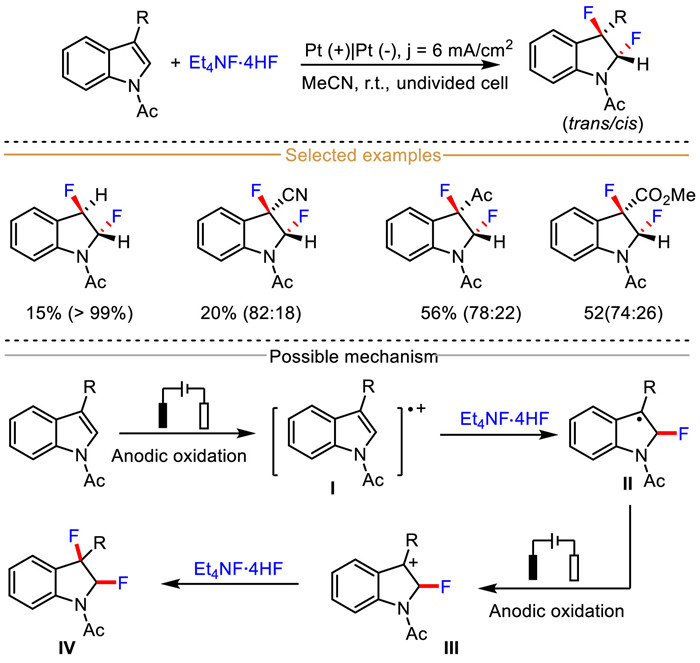 Mechanistic studies have shown that this 2,3-difluorination protocol begins with the anodic single electron oxidation of indole, resulting in indole-derived radical cation Ⅰ. Subsequently, the nucleophilic fluoride ion selectively attacks the 2-position of indole radical cation Ⅰ to deliver the radical intermediate Ⅱ, which is further oxidized at anode to afford the cation Ⅲ. Finally, nucleophilic substitution of cation Ⅲ with fluoride ion affords the 2,3-difluoro-2,3-dihydroindoles.