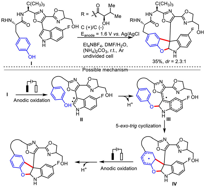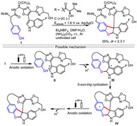 In 2015, Harran et al. described an appealing and efficient electrocatalytic indole radical cation-mediated intramolecular dearomative macrocyclization to construct the benzofuro[2,3-b]indoline core moiety of DZ-2384, a highly potent anticancer agent (Scheme 21) [96]. It is worth noting that the phenol moiety as nucleophile to participate this transformation. In this case, the substrate Ⅰ containing indole and phenol skeleton undergoes anodic single electron oxidation to generate the key radical cation intermediate Ⅱ, and then the phenolic hydroxyl group in the substrate attacks the C-2 position of indole radical cation to produce the radical intermediate Ⅲ owing to the driving force of intramolecular cyclization in the presence of 5 equivalents of ammonium carbonate ((NH4)2CO3). Finally, the anode oxidative deprotonation of radical intermediate Ⅲ affords the target macrocyclic compound.