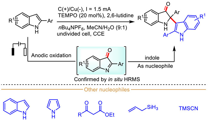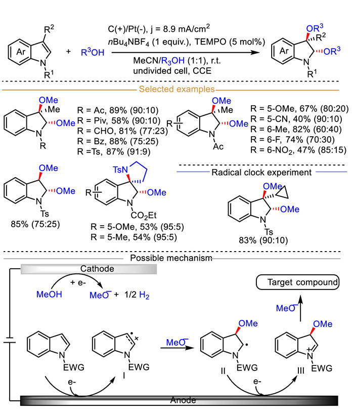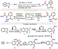 Differently with above-described mechanism by Fuchigami's group, the methoxy anion (MeO−) preferentially attacks the C3-position of indole-derived radical cation Ⅰ generated from the anodic oxidation of indole rather than the C2-position. Then, the resulting C2-centered radical Ⅱ could be oxidized into iminium ion Ⅲ, which then undergoes nucleophilic substitution with MeO− to eventually deliver 2,3-dialkoxylated product.