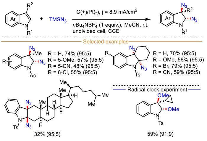 Stimulating by the recent developments in electrochemical diazidation of olefins [99–101], the commonly used nucleophilic azidotrimethylsilane (TMSN3) were also assessed for this electrochemical transformation. As anticipated, a series of N-acetyl indoles were successfully converted to the corresponding 2,3-diazide-2,3-dihydroindoles with excellent trans-diastereoselectivity (Scheme 23). Impressively, the successful synthesis of 2,3-diazide indoles through dearomatization of steroid-derived indole proved the versatility of this developed tool for complex substrates bearing multiple C-H bonds prone to oxidation. Similar to the above-described dialkoxylation reaction, the diazotization of 3-cyclopropyl indole proceed smoothly, and the ring-opening products also was not observed.