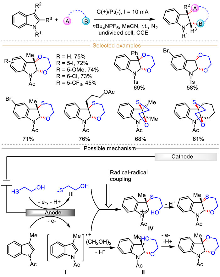Mechanistically, the fast anodic single electron oxidation of indole delivers the radical cation Ⅰ, in which C3 position shows more remarkable radical character affected by phenyl stabilization, and C2 position exhibits more electrophilic character. Then, the indole-derived radical cation Ⅰ generally undergoes two different reaction pathways by utilizing its distinctive properties. One case is that the bis-nucleophile diol preferentially attacks the C2 position of radical cation Ⅰ and loses one H+ to form carbon-centered radical Ⅱ, followed by consecutive anodic oxidation, intramolecular nucleophilic cyclization and deprotonation process to furnish the dearomative 2,3-dialkoxylation product. Apart from this, two different anodic oxidation events occur, including the oxidation of indole and 2-mercaptoethan-1-ol. Subsequentially, radical-radical coupling between indole-derived radical cation Ⅰ and sulfur radical Ⅲ access to cation intermediate Ⅳ. Followed by intramolecular nucleophilic cyclization to produce the desired dearomative product.