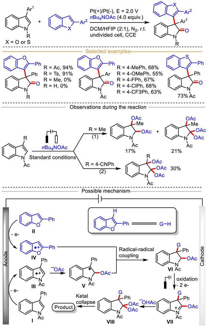 In 2022, Feng et al. described a powerful and scalable electrocatalytic strategy for achieving the selective dearomative 2,3-difunctionalization of indoles with electron-rich aromatic hydrocarbons, including benzofurans and benzothiophenes in an undivided cell (Scheme 26) [104]. Using platinum plate as anode and cathode, and nBu4NOAc as electrolyte, a wide variety of synthetically useful oxindoles were synthesized with good to excellent yields in the absence of any chemical oxidants and transition-metal catalysts. It is worth noting that the choice of mixed solvents (DCE/HFIP) was crucial, among which a single solvent could not effectively facilitate this electrochemical protocol. Furthermore, electrolyte nBu4NOAc was indispensable, and the reaction could not occur without the electrolyte containing OAc−. This reaction featured easily operation, broad substrate scope, and good functional group compatibility. Unsatisfactory, replacing the electron-withdrawing groups at the N-1 position of indole with methyl group or a free N-H, these substrates did not react under optimized conditions.
