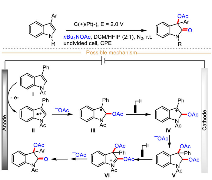 By simply switching the platinum anode to carbon anode, the coupling partner benzofurans did not participate this reaction, and the 3-aryl indoles were selectively converted into 3-aryl-3-hydroxyl-2-oxindoles in moderate yields (Scheme 27). Either the electron-donating or electron-withdrawing group on the indole ring could access to the corresponding products in moderate yields. This electrochemical protocol also begins with the anodic oxidation of 3-aryl indole to furnish the radical cation Ⅱ, which then reacts with acetate ion to generate radical intermediate Ⅲ. Followed by consecutive anodic oxidation and nucleophilic substitution to produce the intermediate Ⅴ. Finally, the target product 3-aryl-3-hydroxyl-2-oxindole is obtained similar to the aforementioned reaction process in Scheme 26.
