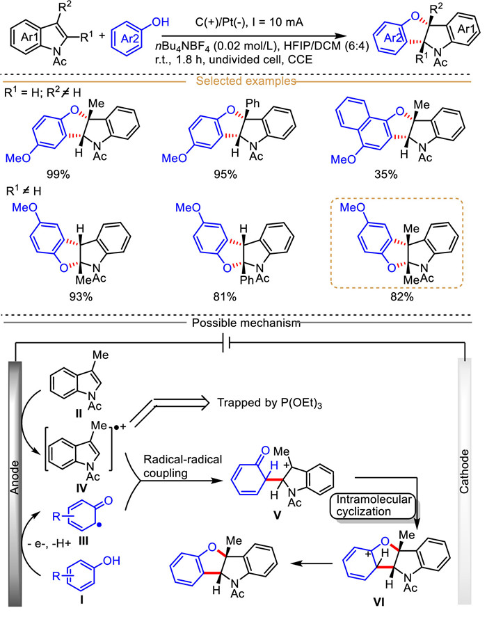 Detailed cyclic voltammetry experimental results revealed that the model reaction partners (3-methyl-N-acetylindole and 4-methoxylphenol) had quite close oxidation potentials, which suggested that it was possible for the simultaneous oxidation of both substrates at the anode surface. Firstly, the single electron oxidation of 4-methoxylphenol Ⅰ occurs accompanied by the deprotonation process to deliver a C-centered radical Ⅲ isomerized from the generated O-centered radical. Meanwhile, N-acetylindole Ⅱ is oxidized at anode into indole-derived radical cation intermediate Ⅳ, which then reacts with the generated radical Ⅲ to give the cation intermediate Ⅴ via a radical-radical coupling process. Finally, intramolecular cyclization occurs to give the intermediate Ⅵ, which then loses one H+ to deliver the target dearomatization product.