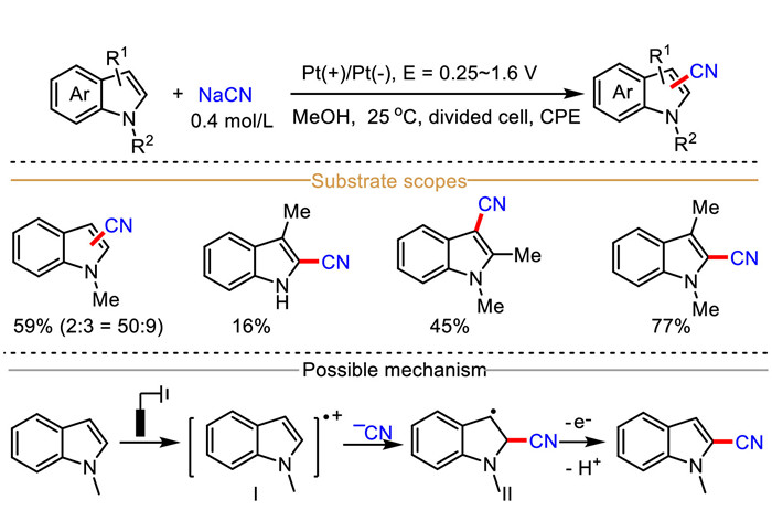 As early as 1977, Yoshida et al. cleverly achieved the first regioselective electrochemical C(sp2)−H cyanation of indoles, in which sodium cyanide (NaCN) severed as cyanide source and electrolyte for the synthesis of C2/C3-cyanated indoles in good yields (Scheme 3) [46]. Moderate regioselectivity was exhibited when 1-methylindole was used as reaction substrate in this electrochemical process, and the C-2 and C-3 cyanylated indoles were obtained in 50% and 9% yields, respectively. Regretfully, only four indoles were discussed in this C–H cyanation protocol. Mechanistically, indole is preferentially oxidized at anode surface to afford radical cation intermediate Ⅰ, which then reacts with cyanide anion to produce carbon-centered radical Ⅱ. Finally, further anodic oxidation and the following deprotonation result in the formation of desired product cyanated indole.