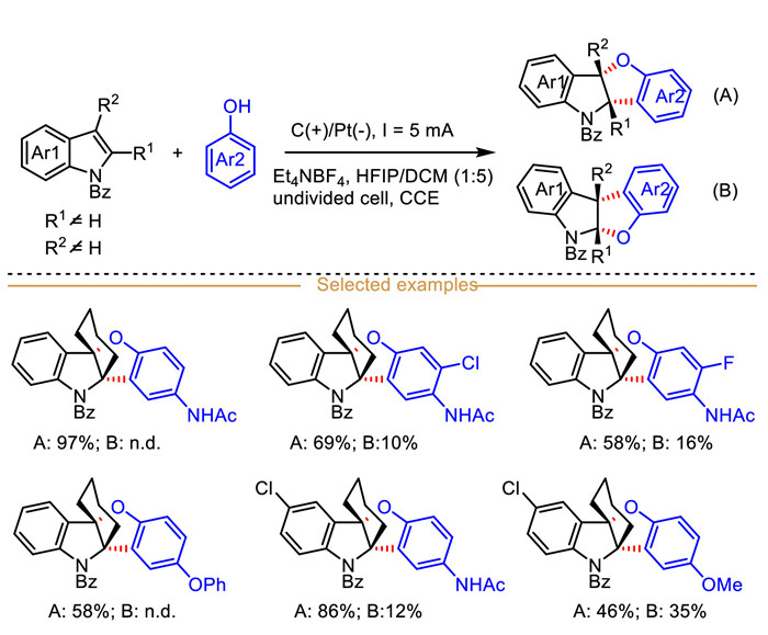| Scheme 31. Electrochemical dearomative [3 + 2] cyclization of phenols with indoles to construct benzofuro[2,3-b]indolines. | |