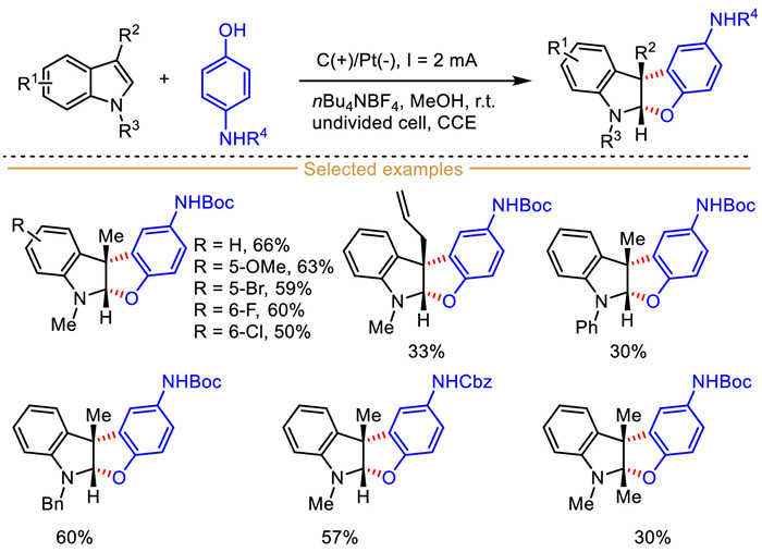 | Scheme 29. Electrochemical dearomative [3 + 2] cyclization of phenols with indoles to construct benzofuro[3,2-b]indolines. | |