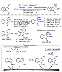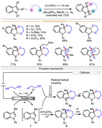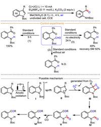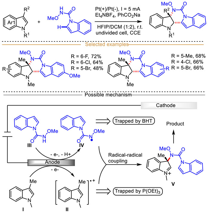 A believable mechanism is presented in Scheme 32. This protocol begins with the anodic oxidation of 1,3-dimethylindole Ⅰ (EOX = 0.6 V vs. Ag/AgCl) to form the indole-derived radical intermediate Ⅱ, which could be trapped by P(OEt3)2 in a control experiment. At the same time, another reaction partner N-methoxy-1H-indole-1-carboxamide Ⅲ (EOX = 1.1 V vs. Ag/AgCl, and a new oxidation peak was observed at 0.6 V in the presence of 1 equiv. PhCOONa) also undergoes anode oxidative deprotonation assisted by the base PhCO2Na to furnish the N-centered radical intermediate Ⅳ captured by radical scavenger BHT. Then, radical–radical cross-coupling between indole radical cation Ⅱ and N-centered radical Ⅳ affords the cation intermediate Ⅴ, followed by intramolecular nucleophilic cyclization and deprotonation process to produce the final dearomative product with excellent regioselectivity.