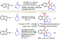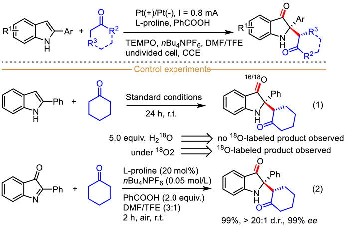 In 2020, He et al. described a highly attractive and creative TEMPO-mediated enantioselective dearomatization of 2-arylindoles with ketones by merging electrocatalysis with organic proline-catalysis (Scheme 33) [119]. This protocol provided an efficient strategy for producing structurally rich and changeable C2-quaternary indolin-3-ones with high enantioselectivity when using L-proline as the chiral catalyst in an undivided cell. In this case, the addition of benzoic acid was beneficial to suppress the side reactions without obviously affecting the enantioselectivity, which might be attributed to the favorable formation of the key imine intermediate. The detailed survey on the substrate scopes of 2-arylindoles bearing electron withdrawing and electron donating groups revealed that the electronic effects exhibited only slight influence on the diastereo- and enantioselectivities of the transformations. A series of detailed isotope-labeling experiments were conducted to investigate the reasonable reaction mechanism. Upon subjecting 2-phenylindole and cyclohexanone to this system in the presence of 5.0 equiv. H218O, no 18O-labeling product was observed. Meanwhile, the model reaction was performed in the 18O2 atmosphere, and it was found that the oxygen atom in the product was labeled by 18O (Scheme 33, Eq. 1). These results supported that O-atom of the carbonyl is derived from molecular O2, not H2O. In previous reports, the single electron oxidation of 2-phenylindole can usually form the key intermediate 2-phenyl-3H-indol-3-one in the presence of O2 [120]. As anticipated, the synthetic 2-phenyl-3H-indol-3-one was quantitatively converted to the corresponding C2-quaternary indolin-3-ones with excellent enantioselectivity under standard conditions without electricity, which demonstrated that 2-phenyl-3H-indol-3-one was a key intermediate, and the followed transformation does not require the participation of electricity (Scheme 33, Eq. 2).