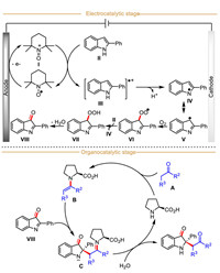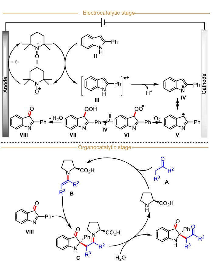 Based on the above-mentioned control experimental results, a logical mechanism is outlined in Scheme 34. Initially, TEMPO (EOX = 0.78 V vs. Ag/AgCl) is oxidized into the TEMPO+ Ⅰ at the anode, which then in turn oxidizes 2-phenylindole Ⅱ (EOX = 1.02 V vs. Ag/AgCl) to produce the key indole-derived radical cation Ⅲ. Subsequentially, the radical cation Ⅲ loses one H+ to generate carbon-centered radical Ⅴ (trapped by BHT), which is rapidly captured by molecular O2 to access radical intermediate Ⅵ. Followed by hydrogen atom transfer between substrate 2-phenylindole with radical Ⅵ to afford intermediate Ⅶ, which loses one molecule of H2O to give the key intermediate 2-phenyl-3H-indol-3-one Ⅷ. Notably. the above-described control experiments indicated that the subsequent transformation of intermediate Ⅷ does not involve electro-redox processes. In the organic catalytic cycle, the electron-rich enamine B, generated by condensation of ketone with L-proline, undergoes a nucleophilic addition to intermediate Ⅷ to deliver the intermediate C, followed by the hydrolysis process to give the final product.