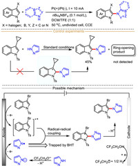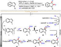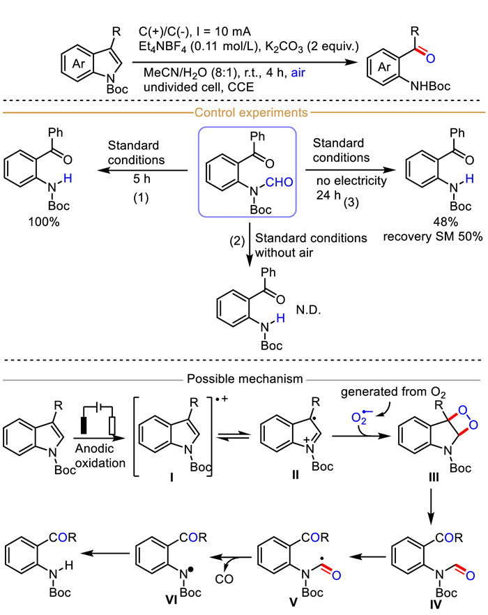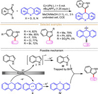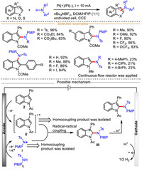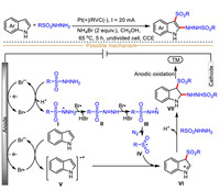 Mechanistically, the redox medium NH4Br (lower oxidation potential compared with indole and sulfonyl hydrazide) is firstly oxidized into bromine radical, which then in turn oxidizes sulfonyl hydrazide into radical intermediate Ⅰ. Then, the radical intermediate Ⅰ undergoes two consecutive oxidations by bromine radicals to afford the nitrogen-centered radical Ⅲ, which then loses one molecular nitrogen to produce sulfonyl radical Ⅳ. Meanwhile, indole could similarly be oxidized by the anode formed bromine radical to generate indole-derived radical cation intermediate Ⅴ, which then reacts with sulfonyl radical Ⅳ to give intermediate Ⅵ via a radical-radical coupling process. Finally, a nucleophilic addition occurs between intermediate Ⅵ and sulfonyl hydrazide to furnish the intermediate Ⅶ, followed by quick aromatization to produce final functionalized indole.