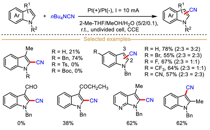 Although efficient and straightforward electrochemical C–H cyanation of indoles has been established, it is hard to elude the use of large excess of highly toxic sodium cyanide, limiting its potential further implementation in synthetic chemistry. In 2022, Lecomte et al. illustrated a sustainable and scalable electrochemical strategy for the direct C–H cyanation of indoles using non-volatile and stable tetrabutylammonium cyanide (nBu4NCN) as cyanide source in less excess as compared to above-described method (Scheme 4) [47]. Remarkably, this reaction proceeded also smoothly for unprotected N–H free indole, thus broadening the scope for late-stage functionalization. Not only that, the indoles without substituents at C2- and C3-position could react with nBu4NCN with moderate regioselectivity as well. Furthermore, the practicality of this method was illustrated in a continuous-flow electrochemical reactor, thereby facilitating the potential for further synthetic applications. Unfortunately, the C(sp2)−H cyanation of N-Ts indole, N-Boc indole, and indole-3-carbaldehyde remain challenging. Cyclic voltammetry analysis showed that N-benzyl indole had a lower oxidation potential than nBu4NCN, indicating that this C–H cyanation reaction began with the anodic oxidation of indole.
