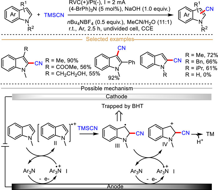 Efforts in developing readily accessible, controllable, and safe cyanation reagent are still highly appreciated in synthetic chemistry. Wang et al. employed simple and readily available trimethylsilyl cyanide (TMSCN) as cyanide source to realize the electrochemically promoted radical cation-mediated C–H cyanation of indoles, in which triarylamine served as redox medium to facilitate this reaction (Scheme 5) [48]. In this protocol, a variety of C2-cyanated indoles without substituents at 3-position were obtained with satisfactory regioselectivity. Cyclic voltammetry studies revealed that 1-phenylindole had a higher oxidation potential (Ep/2 = 1.27 V vs. Ag/AgCl) compared with triarylamine ((4-BrPh)3N) (Ep/2 = 1.10 V vs. Ag/AgCl), supporting that the anodic single-electron oxidation of tris(4-bromophenyl)amine was the initial step. Additionally, the regioselectivity and yield decreased obviously in the absence of triarylamine. These observations clearly showed that tris(4-bromophenyl)amine severed as redox medium to promote the formation of indole-derived radical cation and decrease reaction potential, circumventing the overoxidation of raw materials and products. Mechanistically, the redox medium triarylamine is initially oxidized into radical cation Ⅰ, which in turn oxidizes indole into radical cation Ⅱ. Subsequently, intermediate Ⅱ is captured by nucleophilic TMSCN to give carbon-centered radical Ⅲ captured by radical scavenger 2,6-di-tert-butyl-4-methylphenol (BHT) in control experiment. Finally, the consecutive oxidation and deprotonation affords the final C2/C3 cyanated indoles.