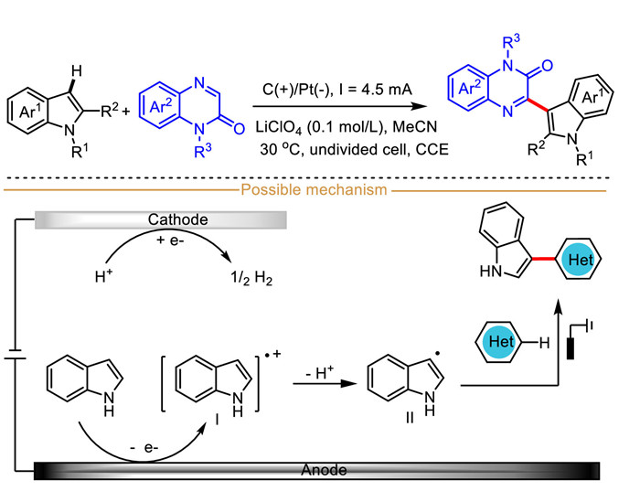In 2022, Lou et al. employed the electrocatalytic indole-derived radical cation strategy to realize the C(sp2)−H arylation of indoles with quinoxalin-2(1H)-ones to synthesize a series of 3-(indol-2-yl)quinoxalin-2(1H)-ones in a undivided cell (Scheme 6) [54]. Generally speaking, solvents have tremendous impact on the reaction outcomes. Using other solvents, such as MeOH, DMSO, DMF, H2O or acetone instead of acetonitrile as the reaction solvent, only trace or no target product was detected. Besides, the choice of electrode material had a great influence on the reaction as well, for examples, almost no product was detected when using a graphite rod instead of platinum plate as cathode. Cyclic voltammetry results showed that indole (EOX = 1.18 V vs. Ag/AgCl) had a lower oxidation potential than quinoxalin-2(1H)-one (EOX = 1.77 V vs. Ag/AgCl), which suggested that C(sp2)−H arylation began with the oxidation of indole via an single electron transfer oxidation process on the anode surface. Differently, the anode generated indole-derived radical cation Ⅰ loses one H+ preferentially to furnish indole radical intermediate Ⅱ rather than directly reacts with quinoxalin-2(1H)-one. Finally, indole radical intermediate Ⅱ attacks the quinoxalin-2(1H)-one, accompanied by anode oxidative deprotonation, to produce C3 arylated indoles.