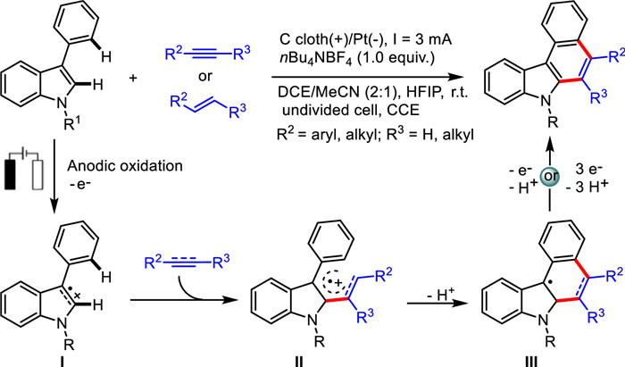 Detailed cyclic voltammetry and control experimental results showed that 3-arylindole may first be oxidized into the radical cation Ⅰ through single electron transfer (SET) at the anode surface, which then could be attacked by alkenes or alkynes to generate a new radical cation intermediate Ⅱ. Subsequentially, the consecutive deprotonation and intramolecular cyclization access to the carbon-centered radical intermediate Ⅲ, which then undergoes further oxidative aromatization to deliver the desired polycyclic heteroaromatic compound.