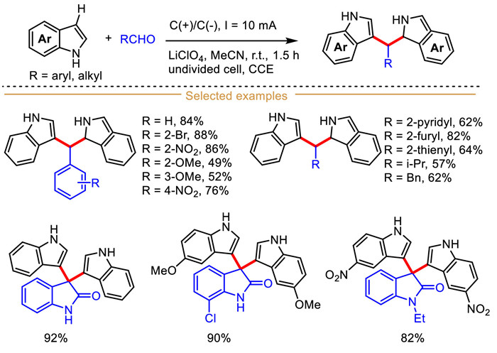 2.4. C(sp2)−H alkylation of indolesBis(indolyl)methanes (BIMs) are privileged structural motif in many natural and synthetic molecules, and their derivatives generally display multiple biological activities, such as antibacterial, anticancer, and anti-inflammatory activities [61,62]. Although many powerful synthetic strategies for synthesizing BIMs have been developed, the challenge with these methods, however, is that they usually require external chemical oxidants, expensive catalysts, elevated temperature, and stoichiometric single-electron-transfer reagents [63–65]. Electrocatalytic strategy provides an attractive and sustainable tool for synthesizing BIMs involving dual C(sp2)–H functionalization process.