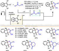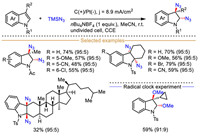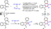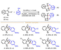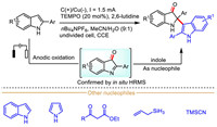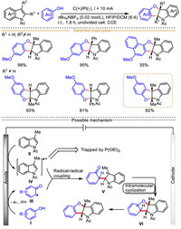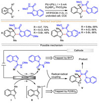 Generally, the electrochemically driven indole-derived radical cations-mediated organic transformations could undergo three different reaction modes by making the use of radical and cation centers, in which: (ⅰ) The indole radical cations are captured by various nucleophiles to deliver alkyl radical species (Scheme 1a), (ⅱ) the indole radical cations react with external radical to form electrophilic carbocation species via radical-radical coupling process (Scheme 1b), and (ⅲ) indole radical cation loses one proton to generate aryl radical species (Scheme 1c).