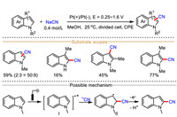 | Scheme 3. Electrochemical C–H cyanation of indoles using NaCN as cyanolation reagent. | |