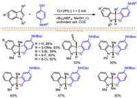3. Indole radical cation-mediated dearomative 2,3-difunctionalization of indolesThe dearomatization of indoles represents a straightforward and powerful synthetic approach for the synthesis of high-value-added indole-based three-dimensional molecules [88–91]. Recently, the vigorous development of the oxidative indole-derived radical cation-mediated C(sp2)-H functionalization of indoles provides an opportunity for the dearomative 2,3-difunctionalization of indoles. The recent oxidative dearomatization strategies mainly rely on stoichiometric oxidant and/or expensive catalyst, which would limit the broader application of indole radical cations in dearomatization reactions [88–94]. Electrocatalysis, a highly appealing synthetic technique, offers convenient for achieving the indole radical cation-mediated dearomative 2,3-difunctionalization of indoles. This section mainly illustrates the synthetic applications of electrocatalytic indole-derived radical cation intermediate for the dearomative 2,3-difunctionalization of indoles.