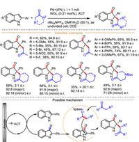 In 2022, the same research team disclosed an unprecedented 4-acetamido-2,2,6,6-tetramethyl-1-piperidineoxy (ACT) initiated enantioselective dearomatization of 2-arylindoles with ketones by merging the enzymatic catalysis with electrocatalysis, resulting in the synthesis of structurally diverse 2,2-disubstituted indolin-3-ones with good enantio- and diastereo-selectivities (Scheme 35) [121]. Usually, only oxidoreductases can be used for electron transfer between electrodes and molecules, and the cofactors are often required in the active sites of oxidoreductases. One of the main roles of electrochemistry is to regenerate the cofactor. In this protocol, wheat germ lipase (WGL), an abundant and readily available hydrolase that general exhibits good stability, high catalytic efficiency, and wide substrate scope, was used to realize this enantioselective electrochemical transformation. Both the electricity and wheat germ lipase played vital roles in this dearomatization reaction; and this transformation does not occur upon the omission of either. Similar to the previously work reported by the same group in 2020 [119], the key intermediate 2-phenyl-3H-indol-3-one is firstly generated in the presence of molecular oxygen under electrochemical conditions. Subsequently, the target product 2,2-disubstituted indolin-3-one is furnished with good enantio- and diastereoselectivities under enzymatic conditions.