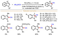 | Scheme 4. Electrochemical C–H cyanation of indoles using nBu4NCN as cyanolation reagent. | |