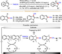 | Scheme 5. Electrochemical C–H cyanation of indoles using TMSCN as cyanolation reagent. | |