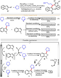 The aforementioned experimental results and detailed cyclic voltammetry studies provide strong evidence for indole-derived radical cation-mediated mechanism, as shown in Scheme 8. 1-Methyl indole (EOX = 1.46 V vs. SCE) is initially oxidized at anode into indole-derived radical cation Ⅰ, which then in turn oxidizes tetrahydrofuran (EOX =1.78 V vs. SCE) into alkyl radical Ⅱ. Subsequently, alkyl radical Ⅱ attacks the 3-position of indole to deliver the carbon-centered radical intermediate Ⅲ, which sequentially undergoes anodic oxidation to produce C3 alkylated intermediate Ⅴ. It is worth mentioning that another possibility, in which alkoxycarbenium ion Ⅳ, generated from the anodic oxidation of tetrahydrofuran, reacts with indole to give C-3 alkylated intermediate Ⅴ, cannot be ruled out. Finally, classic Friedel−Craft alkylation of intermediate Ⅴ with one molecular indole affords the desired bis(indolyl)methane.