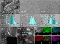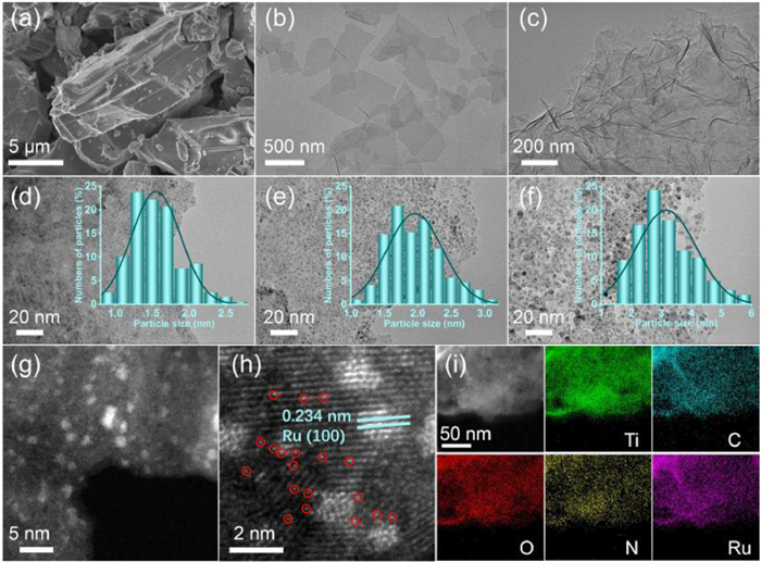 | Fig. 2. Electron microscopy photographs of samples. (a) SEM image of Ti3AlC2. TEM images of (b) Ti3C2Tx, (c, e) TNCR-600, (d) TNCR-500, and (f) TNCR-700. The inset in (d, e, f) showed the statistical distribution of Ru particle sizes. (g, h) HAADF-STEM images and (i) EDX elemental mapping analysis of TNCR-600. The bright dots highlighted by the red circles in (h) were the Ru SA. | |