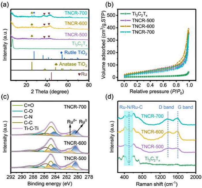 | Fig. 3. Characterization of TNCR samples. (a) XRD patterns, (b) N2 adsorption-desorption isotherms, (c) XPS patterns, and (d) Raman spectroscopy of TNCR samples. | |