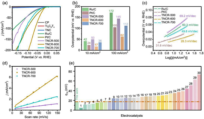 | Fig. 4. Alkaline HER performance test of various samples. (a) HER polarization curves. (b) The corresponding overpotentials of different samples at 10 mA/cm2 and 100 mA/cm2. (c) Tafel plots for the corresponding materials. (d) Calculated double-layer capacitance (Cdl) was used to estimate the electrochemically active surface area of the different samples. (e) Comparison of η10 values for TNCR-600 and other recently reported Ru-based HER electrocatalysts in alkaline media (Information for the referenced samples was summarized in Table S1). | |