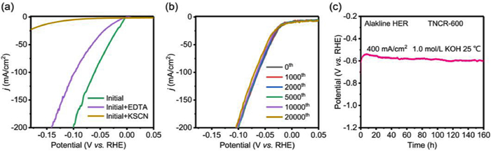 | Fig. 6. Toxicity test and stability of TNCR-600. (a) The HER polarization curves of TNCR-600 poisoned by EDTA (10 mmol/L) and KSCN (10 mmol/L), respectively. (b) Durability measurements for TNCR-600 at the initial, 1000th, 2000th, 5000th, 10000th, and 20000th cycles. (c) Chronopotentiometric (CP) curve recorded at a constant current density of 400 mA/cm2 (without iR correction). | |