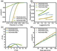 | Fig. 5. HER performance testing across the entire pH range. (a) HER polarization curves, (b) Tafel plots, (c) impedance, and (d) calculated double-layer capacitance of TNCR-600 at different pH values. | |