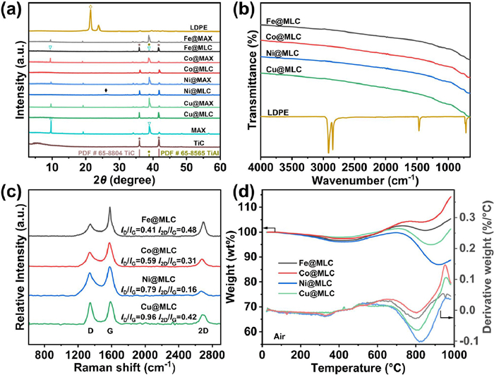 In Powder X-Ray Diffraction (PXRD) patterns of carbon and MAX supported metal catalyst (M@MLC) (Fig. 2a and Fig. S2 in Supporting information), the diffraction peaks at 21.5° and 23.9° corresponding to (110) and (200) reflection planes of LDPE disappeared after microwave treatment, indicating the fully decomposition of LDPE [4]. Furthermore, a broad peak (002) appeared at approximately 26.0°, reflecting the formation of graphitic carbons [9]. Similar to our previous report [5], Ti3AlC2 was decomposed to TiC ((PDF #65-8804) and titanium-aluminum alloy (TiAl, PDF #65-8565) after microwave treatment (Fig. 2a). In a more precise description, M@MLC is a designed complex with metals loading on carbon and TixAlyCz. In ATR-FTIR spectra (Fig. 2b), the three sets of peaks (2914.3 and 2848.7 cm−1, 1471.6 and 1462.0 cm−1, as well as 731.0 and 717.4 cm−1) assigned to the C—C and C—H absorption of LDPE faded [4,5,35], further confirming the complete conversion of LDPE.