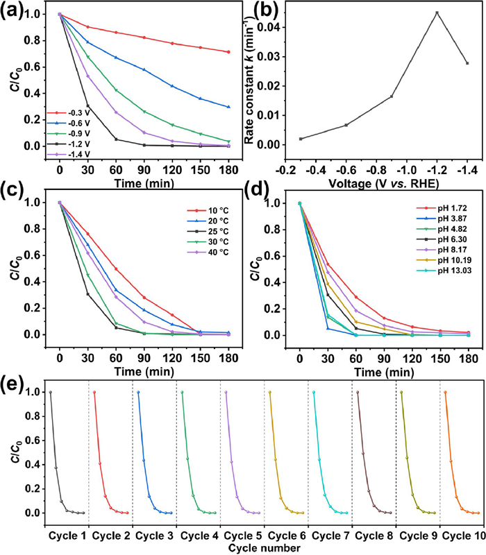 | Fig. 5. CAP degradation performance at different conditions. Effects of (a) applied potentials, (b) rate constants verse voltage, (c) temperatures and (d) pH values on degradation of CAP catalyzed by Fe@MLC; (e) Cycling performance of Fe@MLC. | |