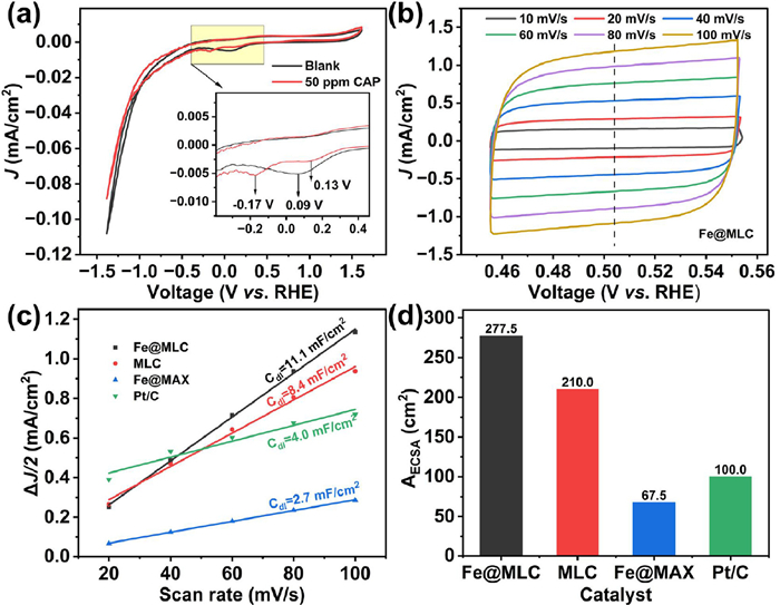 | Fig. 6. (a) Cyclic voltammetry curves of Fe@MLC in 0.5 mol/L Na2SO4 solution (blank) and 50 mg/L CAP solution. (b) CV curves of Fe@MLC at different scan rates. (c) Plots of the current density versus the scan rate and (d) AECSA for Fe@MLC, MLC, Fe@MAX and Pt/C. | |