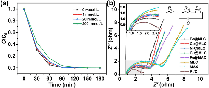 | Fig. 7. (a) Degradation of CAP on Fe@MLC under different t-BuOH concentrations. (b) Nyquist diagrams obtained at different catalyst electrodes. Inset is the equivalent electrical circuit used to fit the EIS data. | |