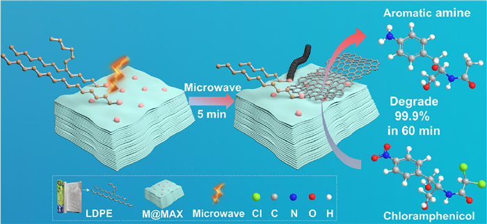 Herein, plastic waste was microwave-initiated catalytically degraded for electrocatalytic water pollution treatment. MAX-Ti3AlC2 supported Fe catalyst (Fe@MAX) was prepared by facile dropwise adding Fe3+ solution into MAX suspension and employed as microwave cataceptor to upcycle polyolefin plastic waste plastic into value-added graphene for chloramphenicol removal for the first time (Scheme 1). Plastic is deconstructed to hydrogen and few layered graphene with few defects in 5 min. Graphene and MAX supported Fe catalyst (Fe@MLC) could completely (99.2%) degrade chloramphenicol within 90 min and retained robust removal efficiency of 96.5% in 120 min after 10 cycles. Moreover, the electrochemical active surface area (ECSA) of Fe@MLC was 2.7 times higher than that of commercial Pt/C. The good electrical conductivity of graphene upcycled from plastic waste promotes the electron transfer in chloramphenicol electrocatalytic reduction. Our results realize the first application of polyolefin waste for electrocatalytic reduction of chloramphenicol, providing a direction of unexpensive catalyst design from plastic waste for waste-water treatment.