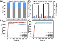 | Fig. 1. LDPE decomposition results catalyzed by M@MAX. (a) gas composition and (b) gas/liquid/solid yields. (c) Temperature and (d) gas volume verse time. | |