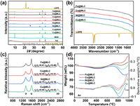 | Fig. 2. Characterization of M@MLC. (a) PXRD patterns, (b) ATR-FTIR spectra, (c) Raman spectra, (d) TPO and DTG curves. | |