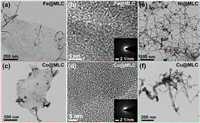 | Fig. 3. Morphology characterization on the solid product M@MLC. (a) TEM image, (b) HRTEM image and SAED pattern of Fe@MLC. (c) TEM image, (d) HRTEM image and SAED pattern of Co@MLC. TEM images of (e) Ni@MLC and (f) Cu@MLC. | |