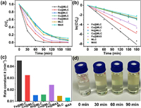 | Fig. 4. (a) Degradation efficiency, (b) pseudo-first order kinetic curves and (c) rate constants catalyzed by different M@MLCs at −1.2 V (vs. RHE), 25 ℃ and initial pH 6.30; (d) Photo of electrolyte after CAP degradation catalyzed by Fe@MLC at −1.2 V (vs. RHE), 25 ℃ and initial pH 6.30. | |