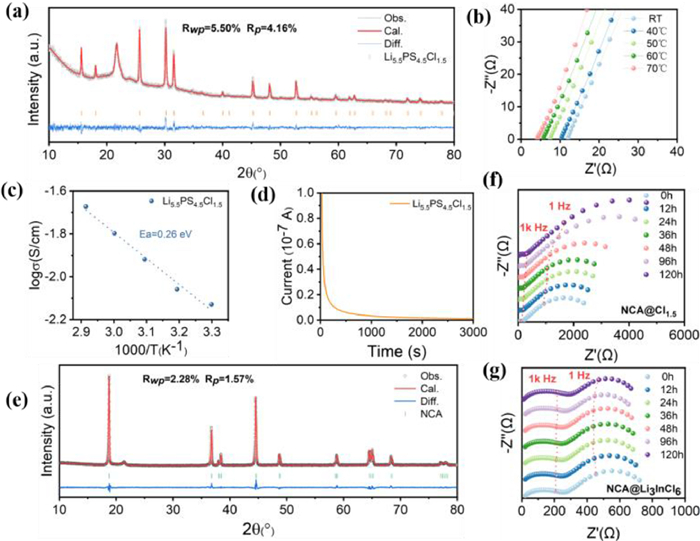 | Fig. 1. (a) XRD refinement of the Li5.5PS4.5Cl1.5 electrolyte. (b) The impedance spectra and (c) the corresponding Arrhenius plots of Li5.5PS4.5Cl1.5 based on ionic conductivities measured at different temperatures. (d) The DC polarization plots of the Li5.5PS4.5Cl1.5. (e) XRD refinement of the NCA cathode. (f) The changes in resistance over time of the cathode mixture consisting of NCA@Cl1.5 and (g) NCA@Li3InCl6. Stainless steel (ST) was used as the blocking electrode during the measurement process. | |